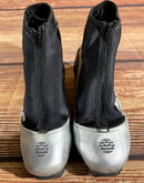 Boots are the most obviously distinctive family of nordic ski boots. They have a 75mm wide "duck bill" at the front of the boot, with three holes on the bottom of the bill that line up with the pins on their appropriate binding.