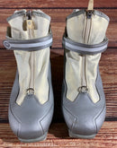 Boots are the most obviously distinctive family of nordic ski boots. They have a 75mm wide "duck bill" at the front of the boot, with three holes on the bottom of the bill that line up with the pins on their appropriate binding.