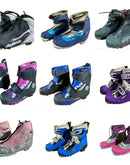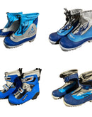 Boots are the most obviously distinctive family of nordic ski boots. They have a 75mm wide "duck bill" at the front of the boot, with three holes on the bottom of the bill that line up with the pins on their appropriate binding.