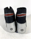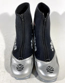 Boots are the most obviously distinctive family of nordic ski boots. They have a 75mm wide "duck bill" at the front of the boot, with three holes on the bottom of the bill that line up with the pins on their appropriate binding.