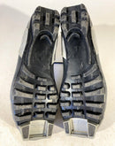 Boots are the most obviously distinctive family of nordic ski boots. They have a 75mm wide "duck bill" at the front of the boot, with three holes on the bottom of the bill that line up with the pins on their appropriate binding.