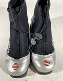 Boots are the most obviously distinctive family of nordic ski boots. They have a 75mm wide "duck bill" at the front of the boot, with three holes on the bottom of the bill that line up with the pins on their appropriate binding.