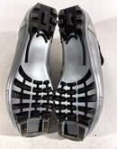 Boots are the most obviously distinctive family of nordic ski boots. They have a 75mm wide "duck bill" at the front of the boot, with three holes on the bottom of the bill that line up with the pins on their appropriate binding.