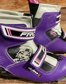 Boots are the most obviously distinctive family of nordic ski boots. They have a 75mm wide "duck bill" at the front of the boot, with three holes on the bottom of the bill that line up with the pins on their appropriate binding.