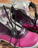 Boots are the most obviously distinctive family of nordic ski boots. They have a 75mm wide "duck bill" at the front of the boot, with three holes on the bottom of the bill that line up with the pins on their appropriate binding.