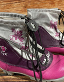Boots are the most obviously distinctive family of nordic ski boots. They have a 75mm wide "duck bill" at the front of the boot, with three holes on the bottom of the bill that line up with the pins on their appropriate binding.