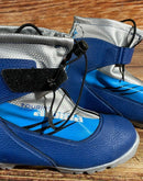 Boots are the most obviously distinctive family of nordic ski boots. They have a 75mm wide "duck bill" at the front of the boot, with three holes on the bottom of the bill that line up with the pins on their appropriate binding.