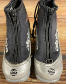 Boots are the most obviously distinctive family of nordic ski boots. They have a 75mm wide "duck bill" at the front of the boot, with three holes on the bottom of the bill that line up with the pins on their appropriate binding.