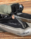 Boots are the most obviously distinctive family of nordic ski boots. They have a 75mm wide "duck bill" at the front of the boot, with three holes on the bottom of the bill that line up with the pins on their appropriate binding.