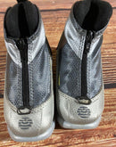Boots are the most obviously distinctive family of nordic ski boots. They have a 75mm wide "duck bill" at the front of the boot, with three holes on the bottom of the bill that line up with the pins on their appropriate binding.