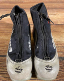 Boots are the most obviously distinctive family of nordic ski boots. They have a 75mm wide "duck bill" at the front of the boot, with three holes on the bottom of the bill that line up with the pins on their appropriate binding.