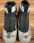 Boots are the most obviously distinctive family of nordic ski boots. They have a 75mm wide "duck bill" at the front of the boot, with three holes on the bottom of the bill that line up with the pins on their appropriate binding.