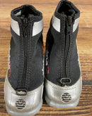 Boots are the most obviously distinctive family of nordic ski boots. They have a 75mm wide "duck bill" at the front of the boot, with three holes on the bottom of the bill that line up with the pins on their appropriate binding.