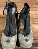 Boots are the most obviously distinctive family of nordic ski boots. They have a 75mm wide "duck bill" at the front of the boot, with three holes on the bottom of the bill that line up with the pins on their appropriate binding.