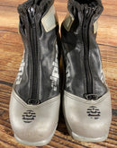 Boots are the most obviously distinctive family of nordic ski boots. They have a 75mm wide "duck bill" at the front of the boot, with three holes on the bottom of the bill that line up with the pins on their appropriate binding.
