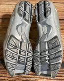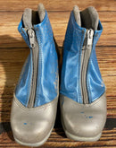 Boots are the most obviously distinctive family of nordic ski boots. They have a 75mm wide "duck bill" at the front of the boot, with three holes on the bottom of the bill that line up with the pins on their appropriate binding.