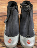 Boots are the most obviously distinctive family of nordic ski boots. They have a 75mm wide "duck bill" at the front of the boot, with three holes on the bottom of the bill that line up with the pins on their appropriate binding.