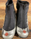 Boots are the most obviously distinctive family of nordic ski boots. They have a 75mm wide "duck bill" at the front of the boot, with three holes on the bottom of the bill that line up with the pins on their appropriate binding.