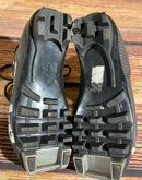 Boots are the most obviously distinctive family of nordic ski boots. They have a 75mm wide "duck bill" at the front of the boot, with three holes on the bottom of the bill that line up with the pins on their appropriate binding.