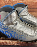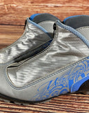 Boots are the most obviously distinctive family of nordic ski boots. They have a 75mm wide "duck bill" at the front of the boot, with three holes on the bottom of the bill that line up with the pins on their appropriate binding.
