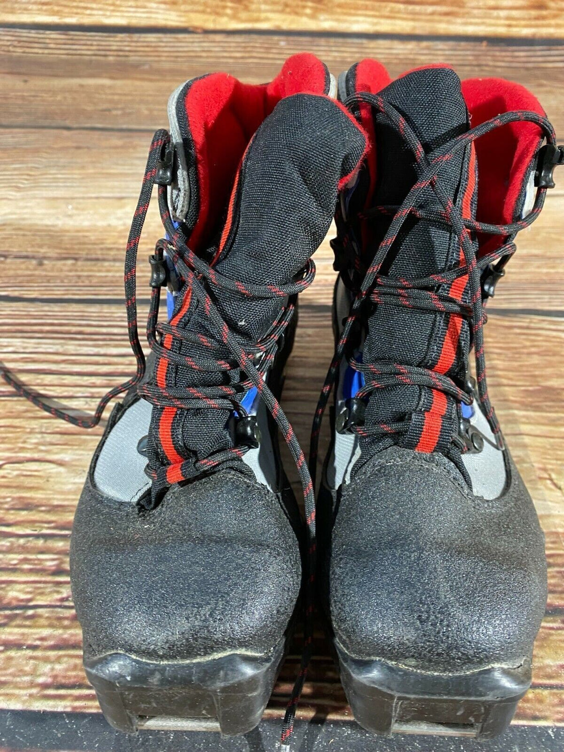 Boots are the most obviously distinctive family of Nordic ski boots. They have a 75mm wide "duck bill" at the front of the boot, with three holes on the bottom of the bill that line up with the pins on their appropriate binding.