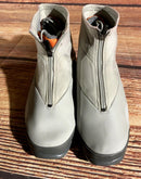 Boots are the most obviously distinctive family of nordic ski boots. They have a 75mm wide "duck bill" at the front of the boot, with three holes on the bottom of the bill that line up with the pins on their appropriate binding.