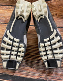 Boots are the most obviously distinctive family of nordic ski boots. They have a 75mm wide "duck bill" at the front of the boot, with three holes on the bottom of the bill that line up with the pins on their appropriate binding.