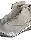 Boots are the most obviously distinctive family of nordic ski boots. They have a 75mm wide "duck bill" at the front of the boot, with three holes on the bottom of the bill that line up with the pins on their appropriate binding.
