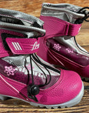 Boots are the most obviously distinctive family of nordic ski boots. They have a 75mm wide "duck bill" at the front of the boot, with three holes on the bottom of the bill that line up with the pins on their appropriate binding.