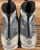 Boots are the most obviously distinctive family of nordic ski boots. They have a 75mm wide "duck bill" at the front of the boot, with three holes on the bottom of the bill that line up with the pins on their appropriate binding.
