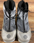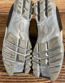 Boots are the most obviously distinctive family of nordic ski boots. They have a 75mm wide "duck bill" at the front of the boot, with three holes on the bottom of the bill that line up with the pins on their appropriate binding.
