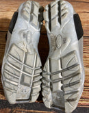 Boots are the most obviously distinctive family of nordic ski boots. They have a 75mm wide "duck bill" at the front of the boot, with three holes on the bottom of the bill that line up with the pins on their appropriate binding.