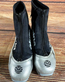 Boots are the most obviously distinctive family of nordic ski boots. They have a 75mm wide "duck bill" at the front of the boot, with three holes on the bottom of the bill that line up with the pins on their appropriate binding.