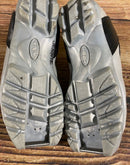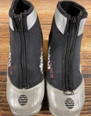 Boots are the most obviously distinctive family of nordic ski boots. They have a 75mm wide "duck bill" at the front of the boot, with three holes on the bottom of the bill that line up with the pins on their appropriate binding.