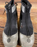 Boots are the most obviously distinctive family of nordic ski boots. They have a 75mm wide "duck bill" at the front of the boot, with three holes on the bottom of the bill that line up with the pins on their appropriate binding.