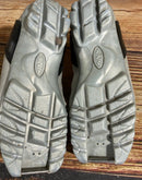 Boots are the most obviously distinctive family of nordic ski boots. They have a 75mm wide "duck bill" at the front of the boot, with three holes on the bottom of the bill that line up with the pins on their appropriate binding.