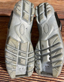 Boots are the most obviously distinctive family of nordic ski boots. They have a 75mm wide "duck bill" at the front of the boot, with three holes on the bottom of the bill that line up with the pins on their appropriate binding.