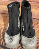 Boots are the most obviously distinctive family of nordic ski boots. They have a 75mm wide "duck bill" at the front of the boot, with three holes on the bottom of the bill that line up with the pins on their appropriate binding.