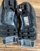 Boots are the most obviously distinctive family of nordic ski boots. They have a 75mm wide "duck bill" at the front of the boot, with three holes on the bottom of the bill that line up with the pins on their appropriate binding.
