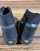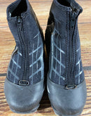 Boots are the most obviously distinctive family of nordic ski boots. They have a 75mm wide "duck bill" at the front of the boot, with three holes on the bottom of the bill that line up with the pins on their appropriate binding.