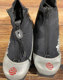 Boots are the most obviously distinctive family of nordic ski boots. They have a 75mm wide "duck bill" at the front of the boot, with three holes on the bottom of the bill that line up with the pins on their appropriate binding.