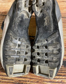 Boots are the most obviously distinctive family of nordic ski boots. They have a 75mm wide "duck bill" at the front of the boot, with three holes on the bottom of the bill that line up with the pins on their appropriate binding.