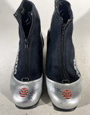 Boots are the most obviously distinctive family of nordic ski boots. They have a 75mm wide "duck bill" at the front of the boot, with three holes on the bottom of the bill that line up with the pins on their appropriate binding.