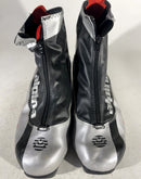 Boots are the most obviously distinctive family of nordic ski boots. They have a 75mm wide "duck bill" at the front of the boot, with three holes on the bottom of the bill that line up with the pins on their appropriate binding.