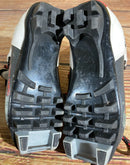 Boots are the most obviously distinctive family of nordic ski boots. They have a 75mm wide "duck bill" at the front of the boot, with three holes on the bottom of the bill that line up with the pins on their appropriate binding.