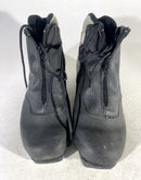Boots are the most obviously distinctive family of nordic ski boots. They have a 75mm wide "duck bill" at the front of the boot, with three holes on the bottom of the bill that line up with the pins on their appropriate binding.