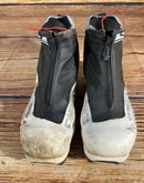 Boots are the most obviously distinctive family of Nordic ski boots. They have a 75mm wide "duck bill" at the front of the boot, with three holes on the bottom of the bill that line up with the pins on their appropriate binding.