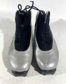 Boots are the most obviously distinctive family of nordic ski boots. They have a 75mm wide "duck bill" at the front of the boot, with three holes on the bottom of the bill that line up with the pins on their appropriate binding.