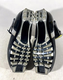 Boots are the most obviously distinctive family of nordic ski boots. They have a 75mm wide "duck bill" at the front of the boot, with three holes on the bottom of the bill that line up with the pins on their appropriate binding.