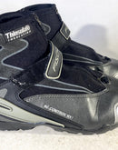 Boots are the most obviously distinctive family of nordic ski boots. They have a 75mm wide "duck bill" at the front of the boot, with three holes on the bottom of the bill that line up with the pins on their appropriate binding.